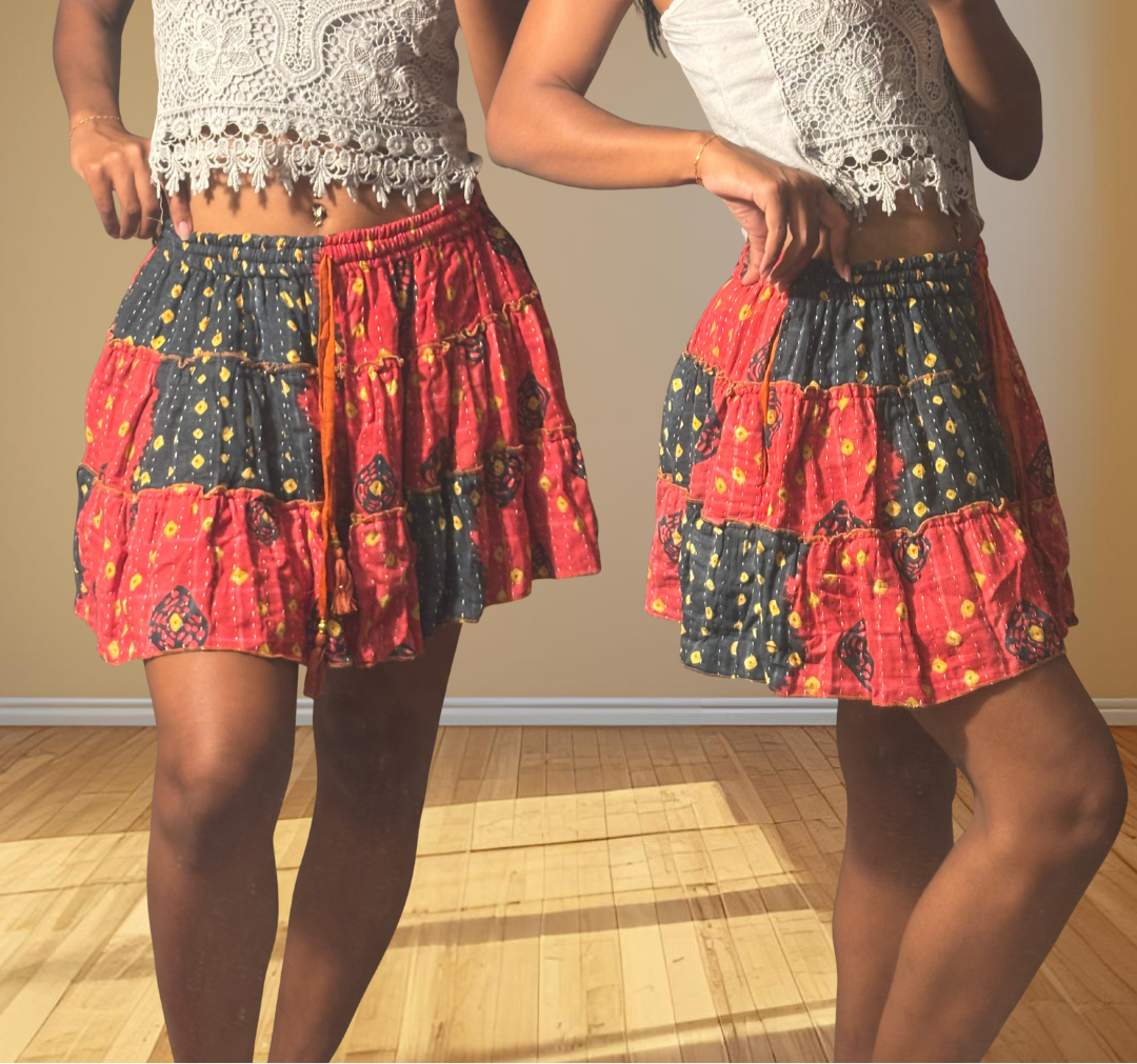 Twirl into summer with this Kantha Tiered Mini Skirt, a boho-chic gem that’s as sustainable as it is stylish. Hand-stitched from upcycled cotton kantha fabric, this flowy, tiered beauty brings effortless hippie vibes to every step. With a comfy elastic waist, adjustable drawstring, and handy side pockets, it’s your go-to for sunny adventures or laid-back lounging. Handmade in Nepal, this one-size skirt fits up to a US Large and wraps you in eco-friendly, slow-fashion charm that’s perfect for your free-spirited wardrobe.