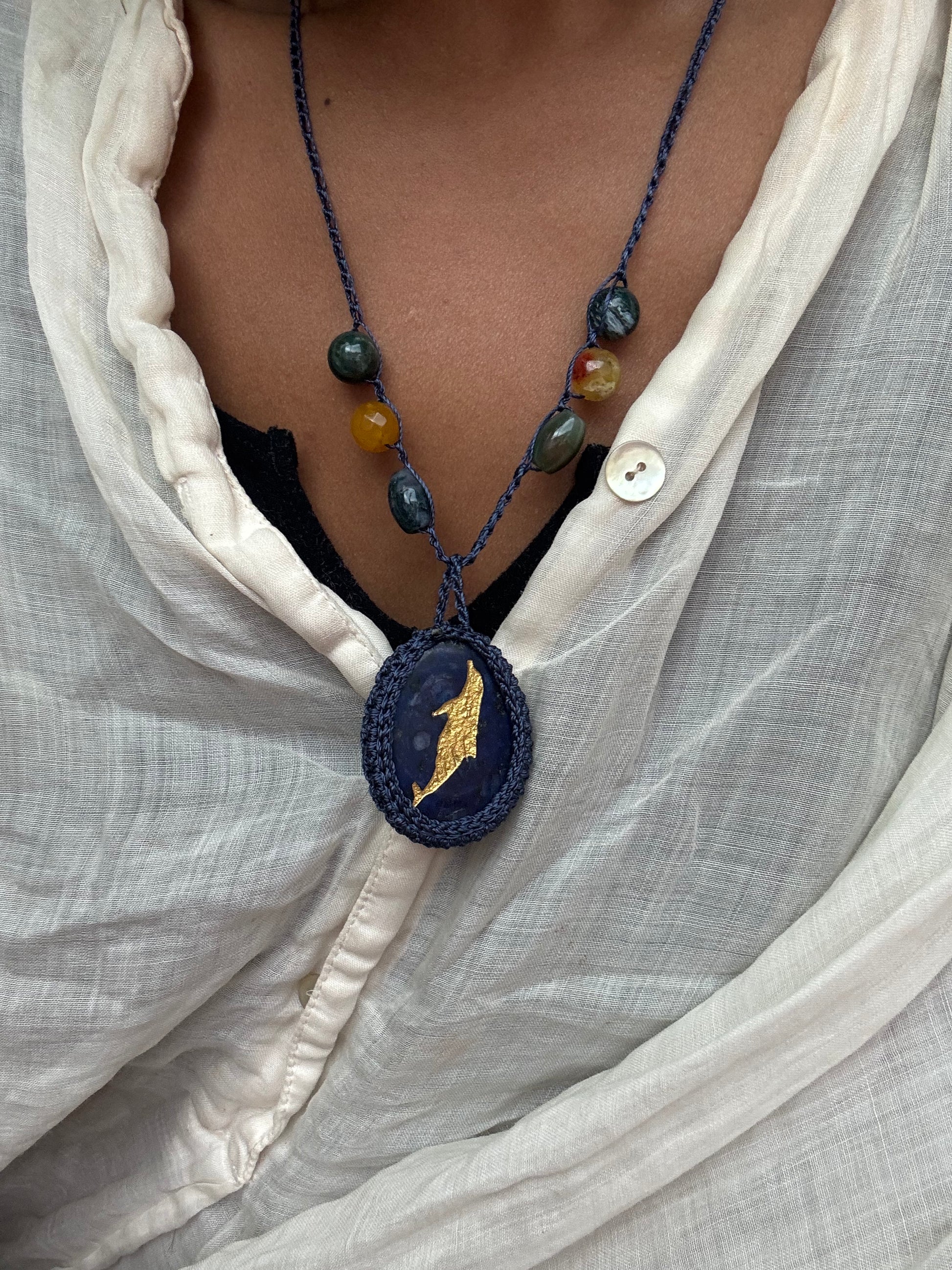These one-of-a-kind hand-crocheted crystal necklaces, encasing a single owl, lizard, or dolphin etched in gold on each crystal, gleam with handwoven crystal-beaded chains for captivating mystic beauty.
