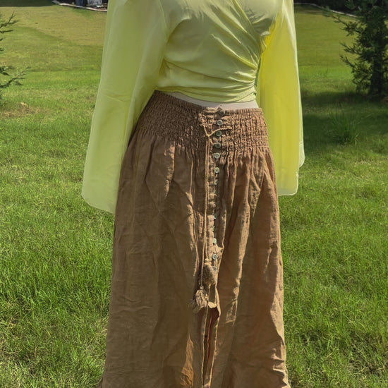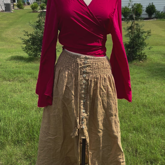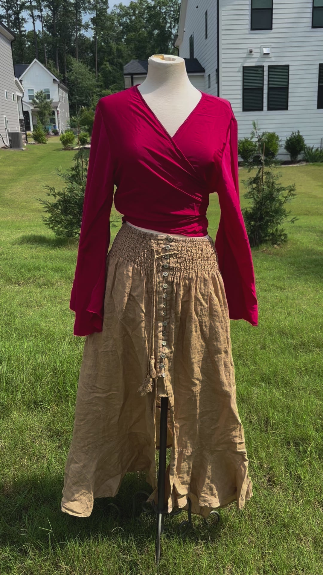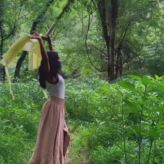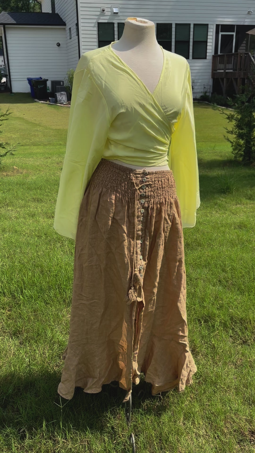 This recycled silk wrap top, vibrant in six luminous shades, drifts with bell sleeves for a free-spirited, starry allure.