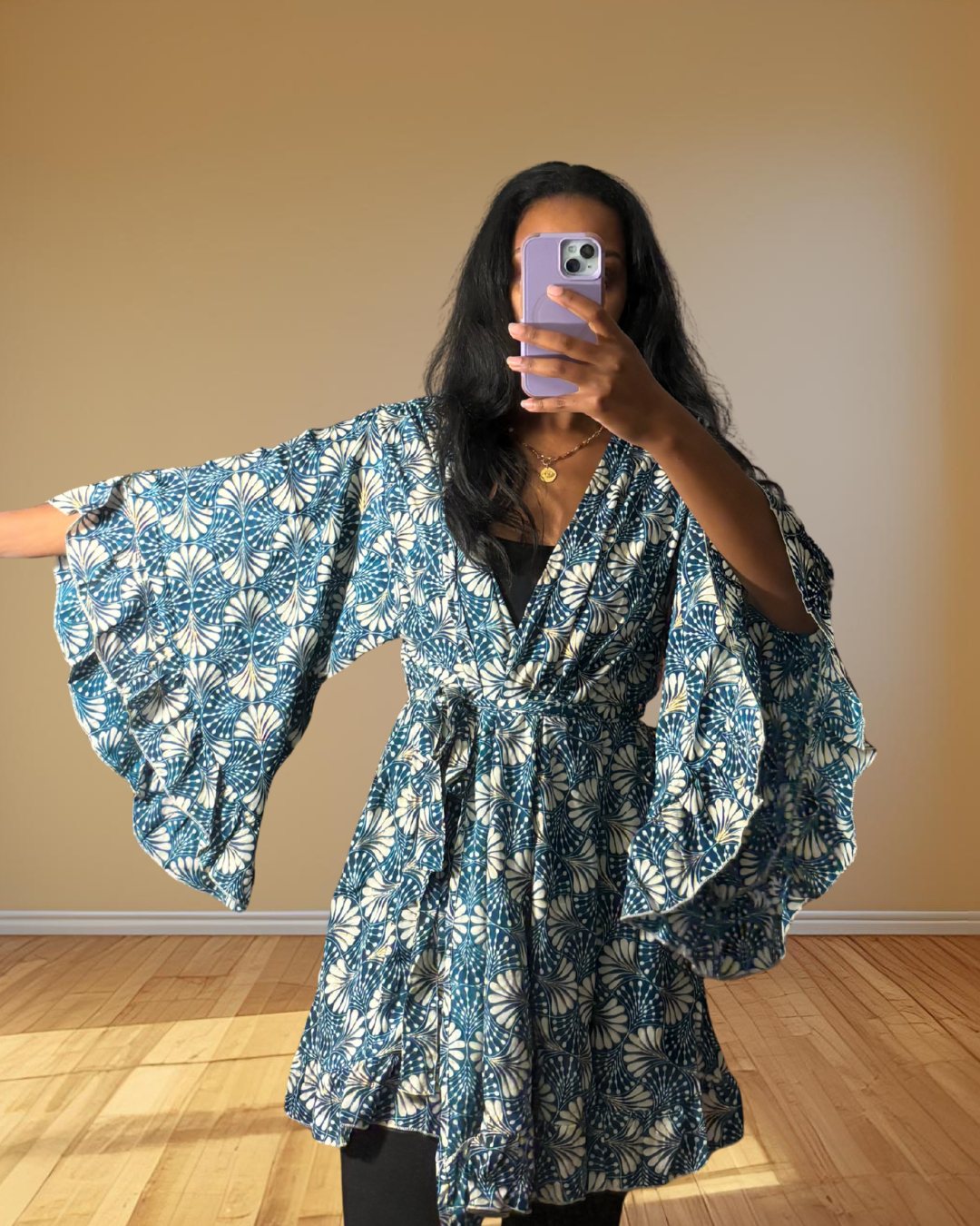 Slip into the Wildflower Kimono and let your boho spirit soar. This handmade gem, with its flowy silhouette and fluttery ruffle sleeves kissed by gold details, brings effortless cool to beach days, bridesmaid vibes, or any sunny moment. Stash your essentials in the handy pockets and float through summer in style. Crafted from a dreamy blend of silk and plant-based viscose, it’s a one-size wonder that fits up to a US Large, wrapping you in pure, breezy magic.