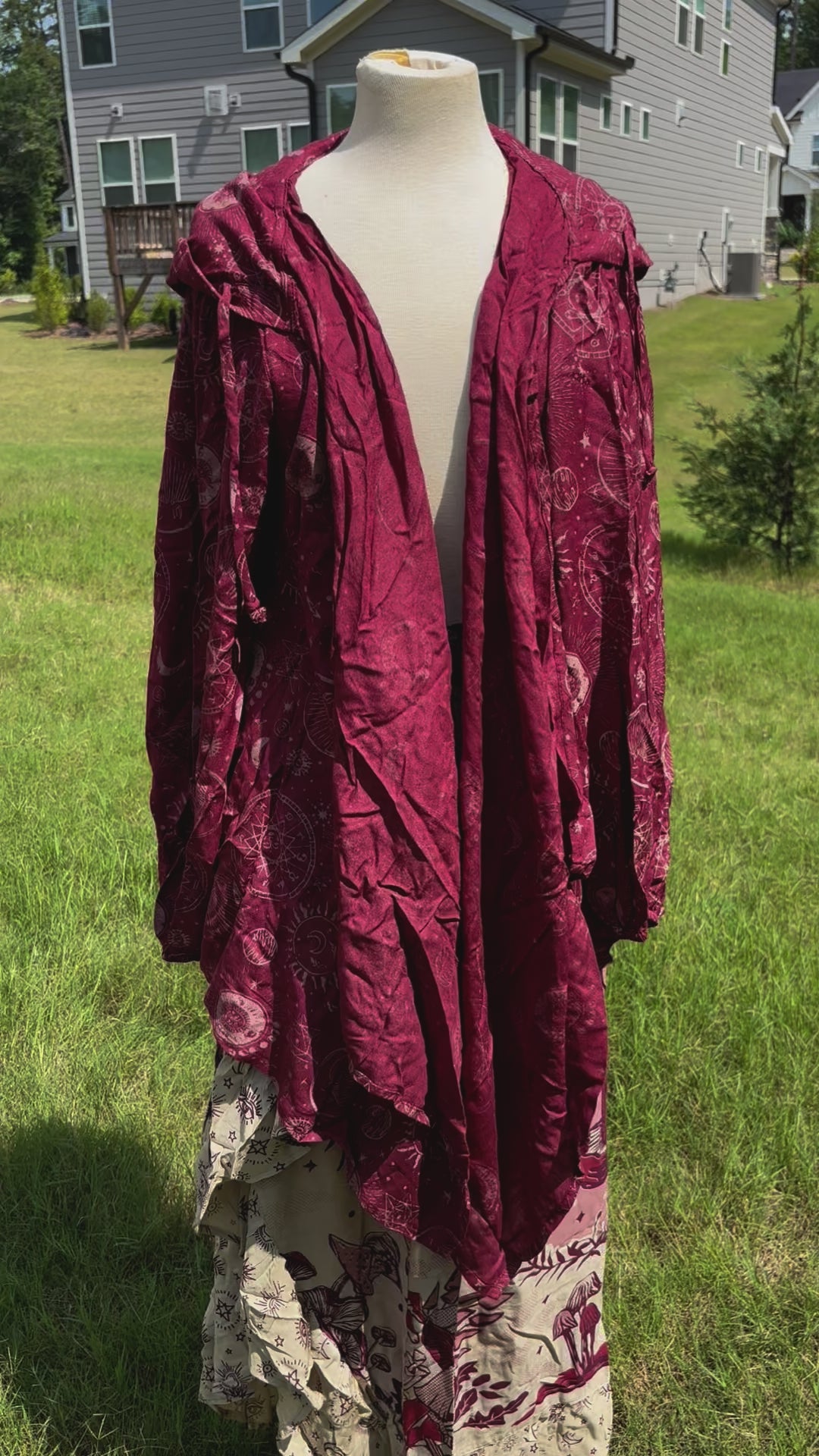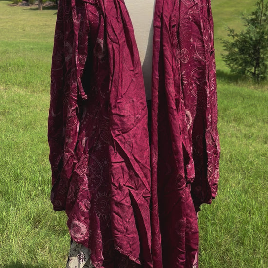 This handcrafted cotton cardigan, adorned with a celestial print and flowing waterfall front, drapes with ethereal beauty for effortless layering. The drapey, breathable cotton fabric makes it perfect for all seasons - from warm summer nights to breezy fall afternoons.