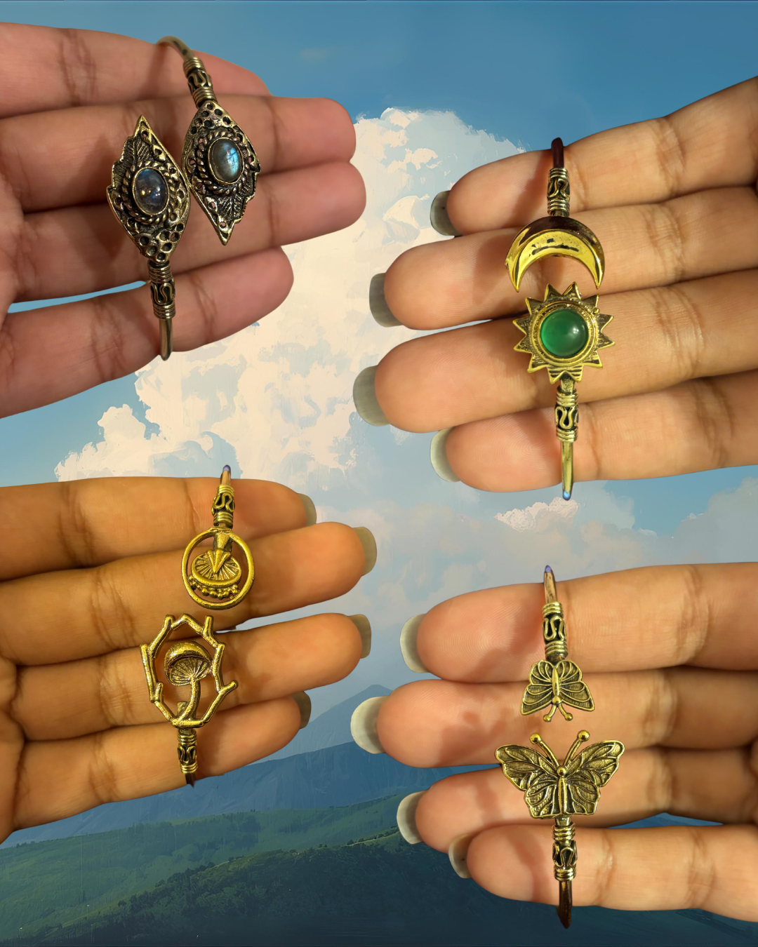 Add a touch of boho magic with this adjustable brass cuff bracelet, handcrafted in India with intricate filigree and scrollwork. Choose from mushroom, labradorite, butterfly, or sun and moon designs to match your free-spirited vibe. Available in silver-plated or gold-tone brass, this one-size-fits-most piece brings earthy, plastic-free shine to any outfit, from sunny days to starry nights.