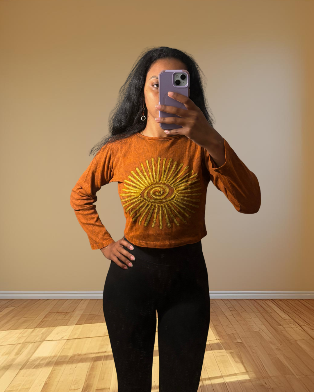 Light up your summer style with this Rust Ray Top, a boho beauty that’s all about carefree vibes and sunny charm. Crafted from 100% cotton in a rich rust hue, and an emrboidered spiral sun, it's perfect for festivals or bonfire nights. The cropped cut pairs effortlessly with high-waisted jeans or your favorite skirt, adding a pop of earthy cool to any look.